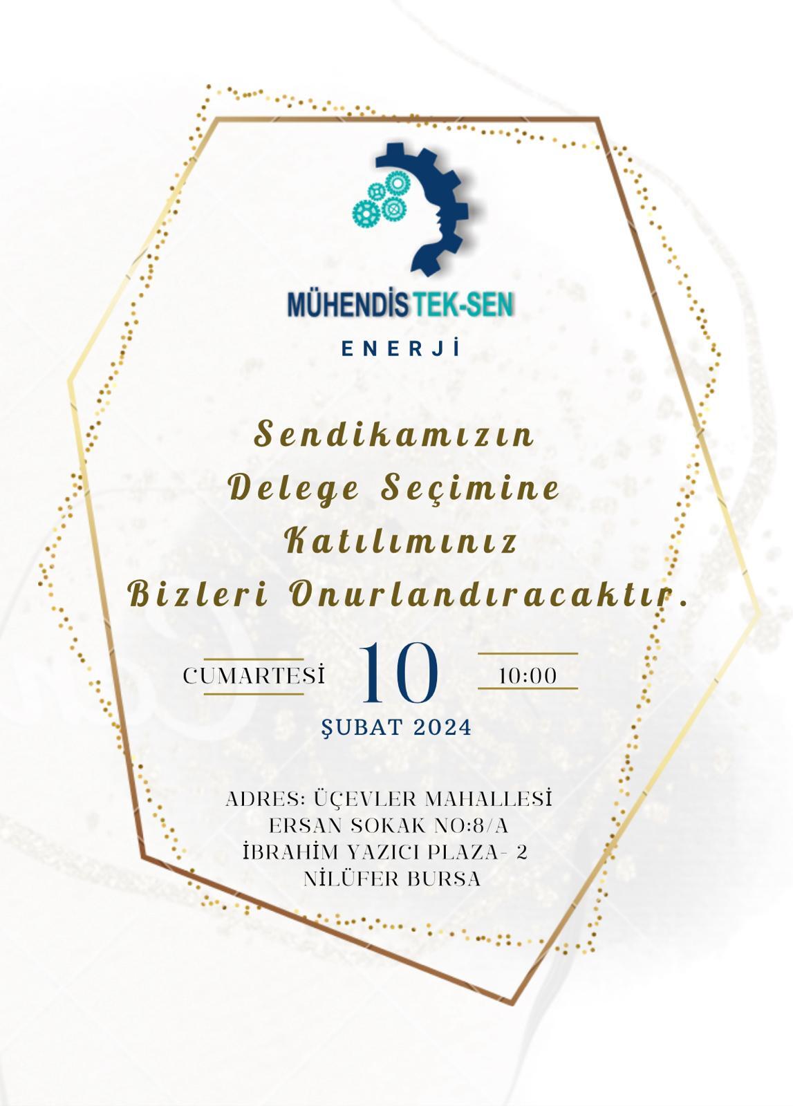Mühendis Teknik Hizmetler ve Diğer Enerji Sanayi ve Madencilik Çalışanları Sendikamızın 1. Olağan Genel Kurulunun yapılabilmesi için 10 Şubat 2024 Cumartesi günü 10:00 – 17:00 saatleri arasında Üçevler Mahallesi Ersan Sokak No:8/A İbrahim Yazıcı Plaza-2 Nilüfer/BURSA adresinde aşağıda yazılı Gündem ile toplanarak Delege Seçimi yapılacaktır.
