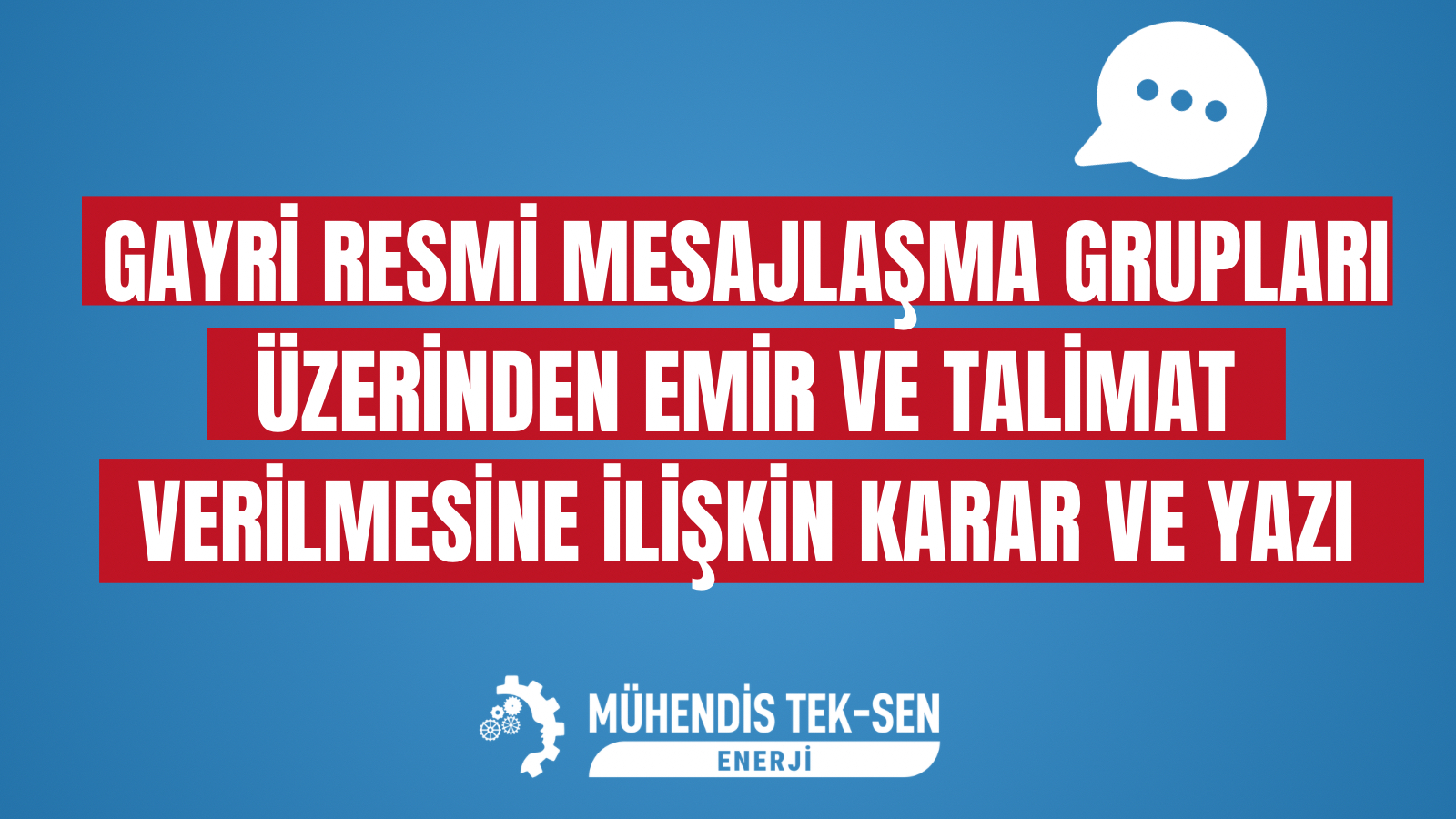 Mühendis Teknik Hizmetler ve Diğer, Enerji, Sanayi ve Madencilik Çalışanları Sendikamıza üyelerimiz tarafından iletilen yoğun şikayetler incelendiğinde; kurumlarda oluşturulan WhatsApp / e-WhatsApp / SMS ve benzeri gayri resmî mesajlaşma grupları üzerinden üyelerimize yönelik emir ve talimat niteliği taşıyan bildirimlerin yapıldığı tespit edilmiştir.