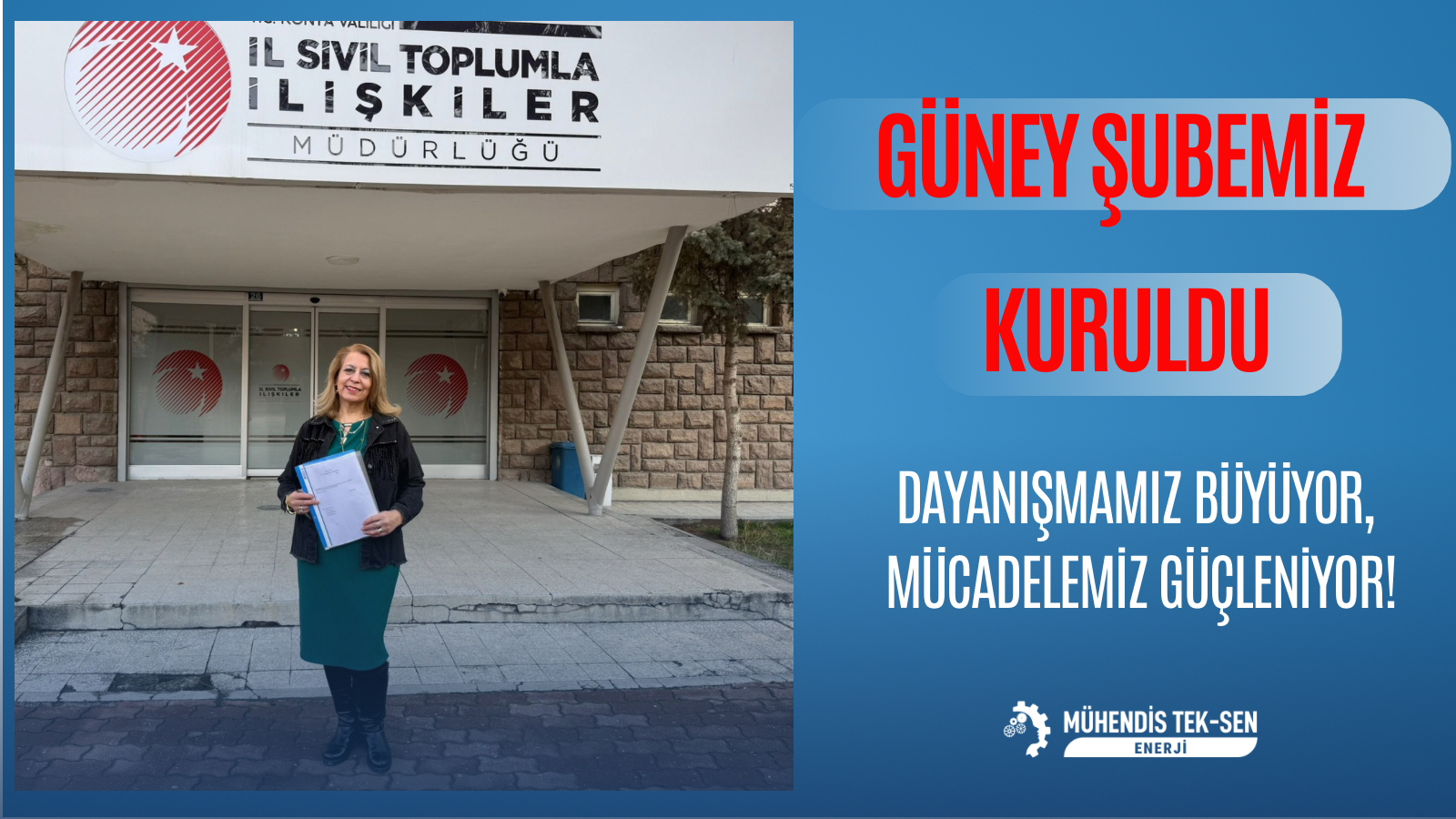 Sendikamızın ülke genelindeki büyüme ve teşkilatlanma vizyonu doğrultusunda Mühendis Tek-Sen ENERJİ GÜNEY Şubemiz resmen kurulmuş ve faaliyetlerine başlamıştır. Bu yeni yapılanma ile birlikte sendikal gücümüz daha da pekişmiş, kurumsal varlığımız yeni bir ivme kazanmıştır.