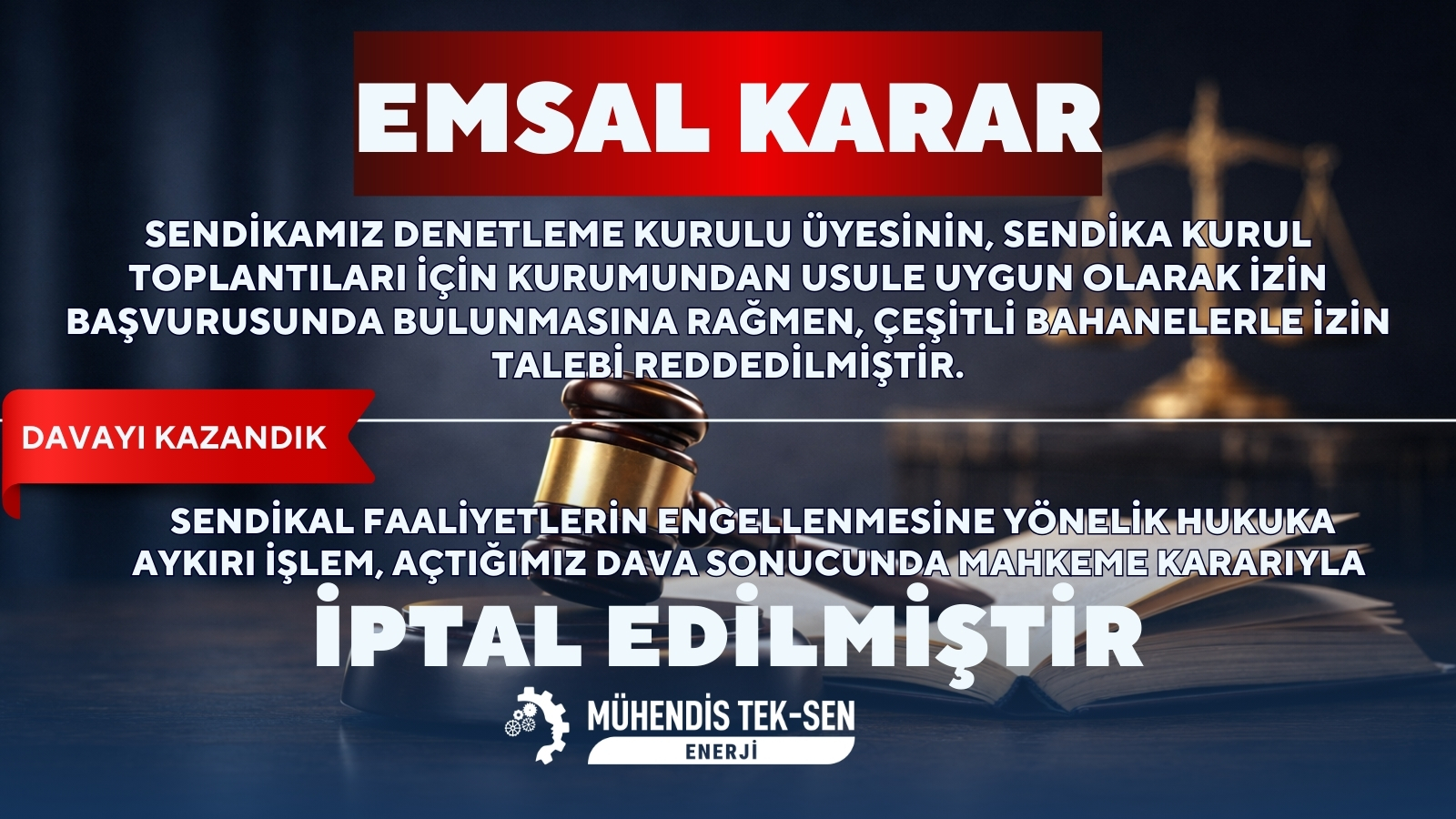 Sendikamızca açılan dava neticesinde mahkeme; sendika denetleme kurulu üyelerinin çalışmalarının engellenmesini sendikal faaliyet hakkına aykırı bularak söz konusu işlemi hukuka aykırı görmüş ve iptal etmiştir.