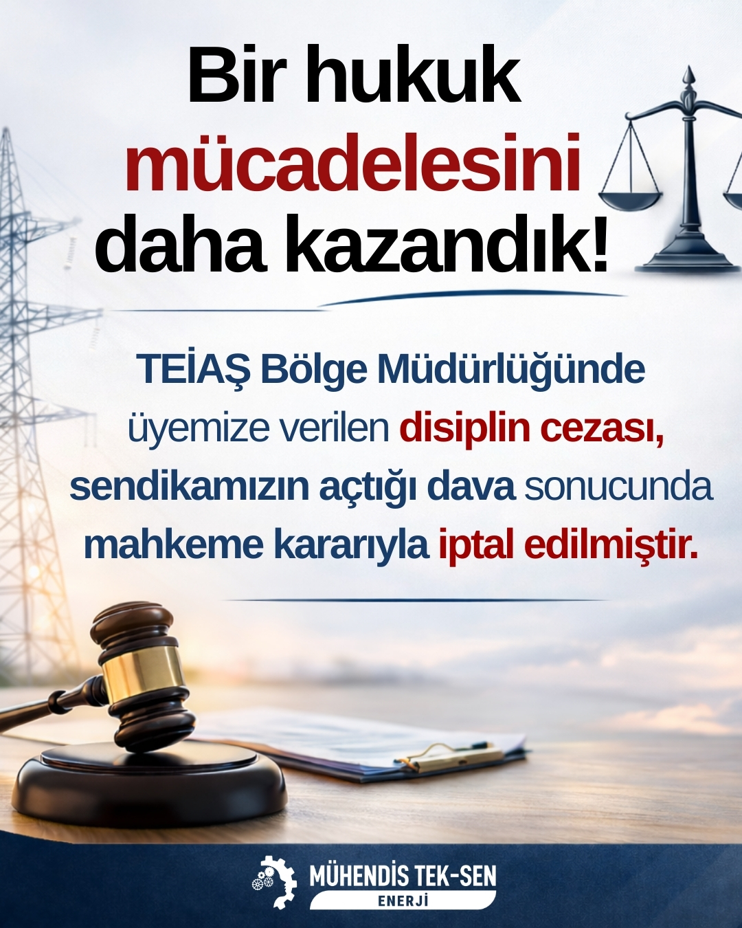 Mühendis Tek-Sen ENERJİ olarak; üyelerimizin mesleki haklarını, itibarını ve çalışma hukukundan doğan kazanımlarını korumak amacıyla hukuki mücadelemizi kararlılıkla sürdürmeye devam edeceğiz.