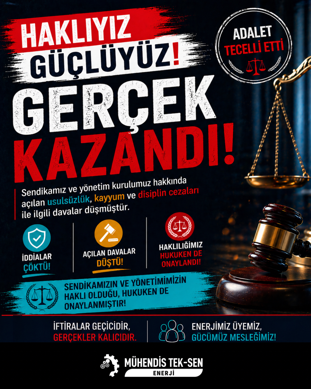 Yargı sürecinde ortaya konulan tüm bilgi ve belgeler ışığında, iddiaların hukuki bir karşılığı bulunmadığı açıkça görülmüş; sendikamızın faaliyetlerinin şeffaf, mevzuata uygun ve usulsüzlükten uzak bir şekilde yürütüldüğü hukuk önünde de teyit edilmiştir.