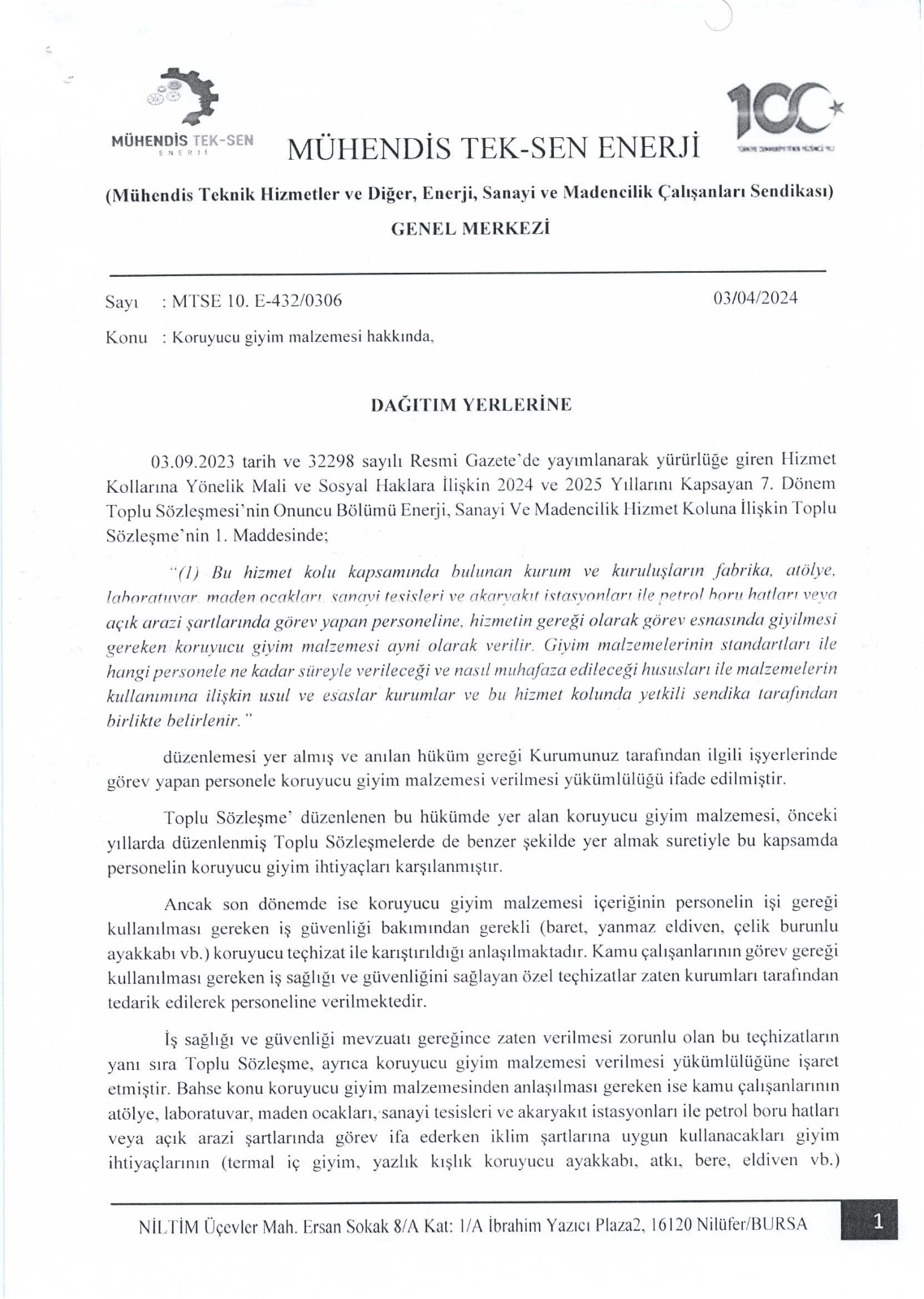 Koruyucu giyim malzemesi hakkımız ile ilgili olarak koruyucu giyim malzemesi hakkımızın uygulama esaslarının ve takviminin belirlenip bilgi verilmesi için tüm kurumlara yazı yazıldı ve bu konuda kurumlar ile birlikte müştereken sorumlu olan yetkili sendikayı görevinin sorumluluğunu yerine getirmeye davet ettik.